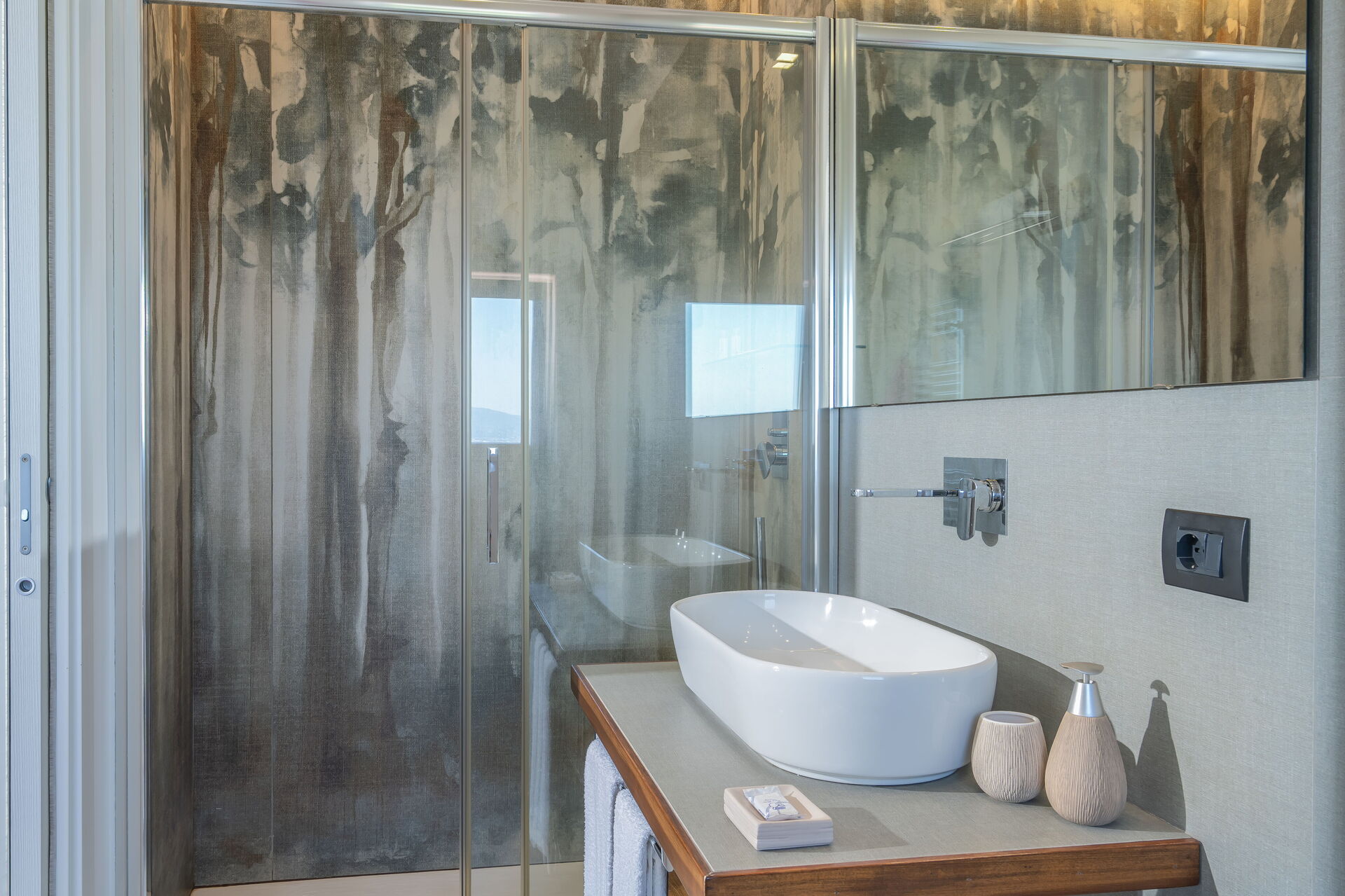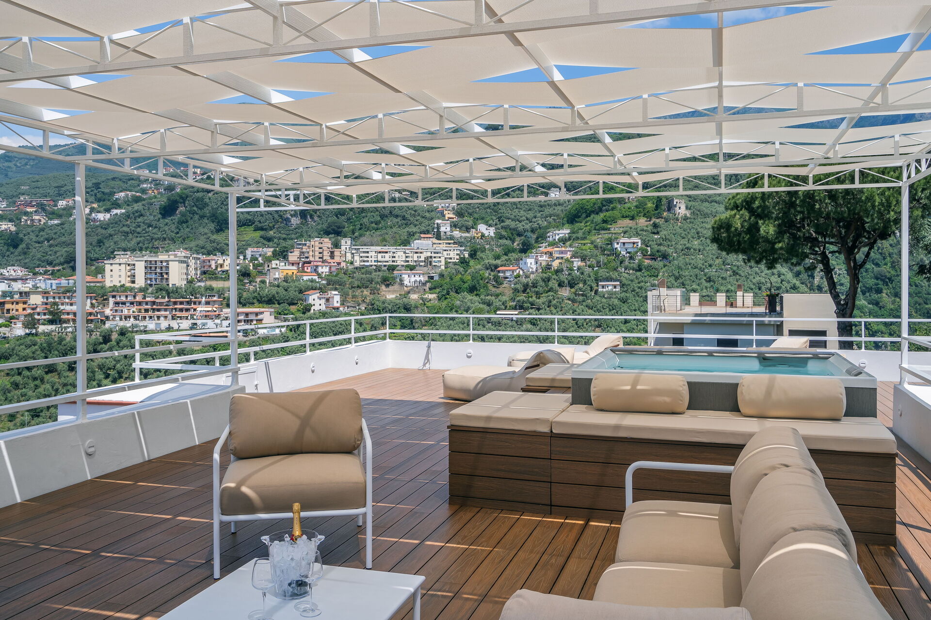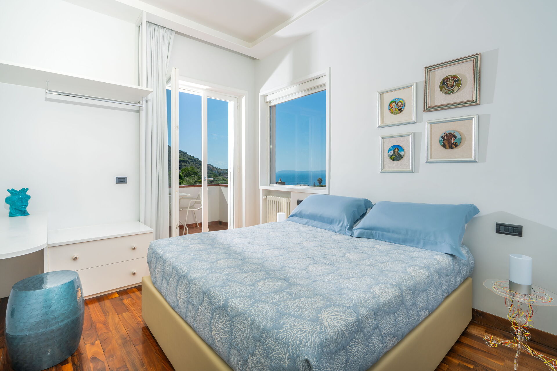 Primo piano: 2 camere matrimoniali entrambe con bagno privato con doccia, camera matrimoniale (il letto matrimoniale può essere diviso in 2 letti singoli su richiesta) con bagno privato con doccia, suite con anticamera con divano letto matrimoniale e camera padronale con letto matrimoniale e bagno privato con vasca jacuzzi e doccia. Ogni camera dispone di smart tv collegata alla fibra wi-fi e un terrazzo attrezzato con tavolo e sedie (due terrazze sono vista mare e due vista giardino e piscina).
