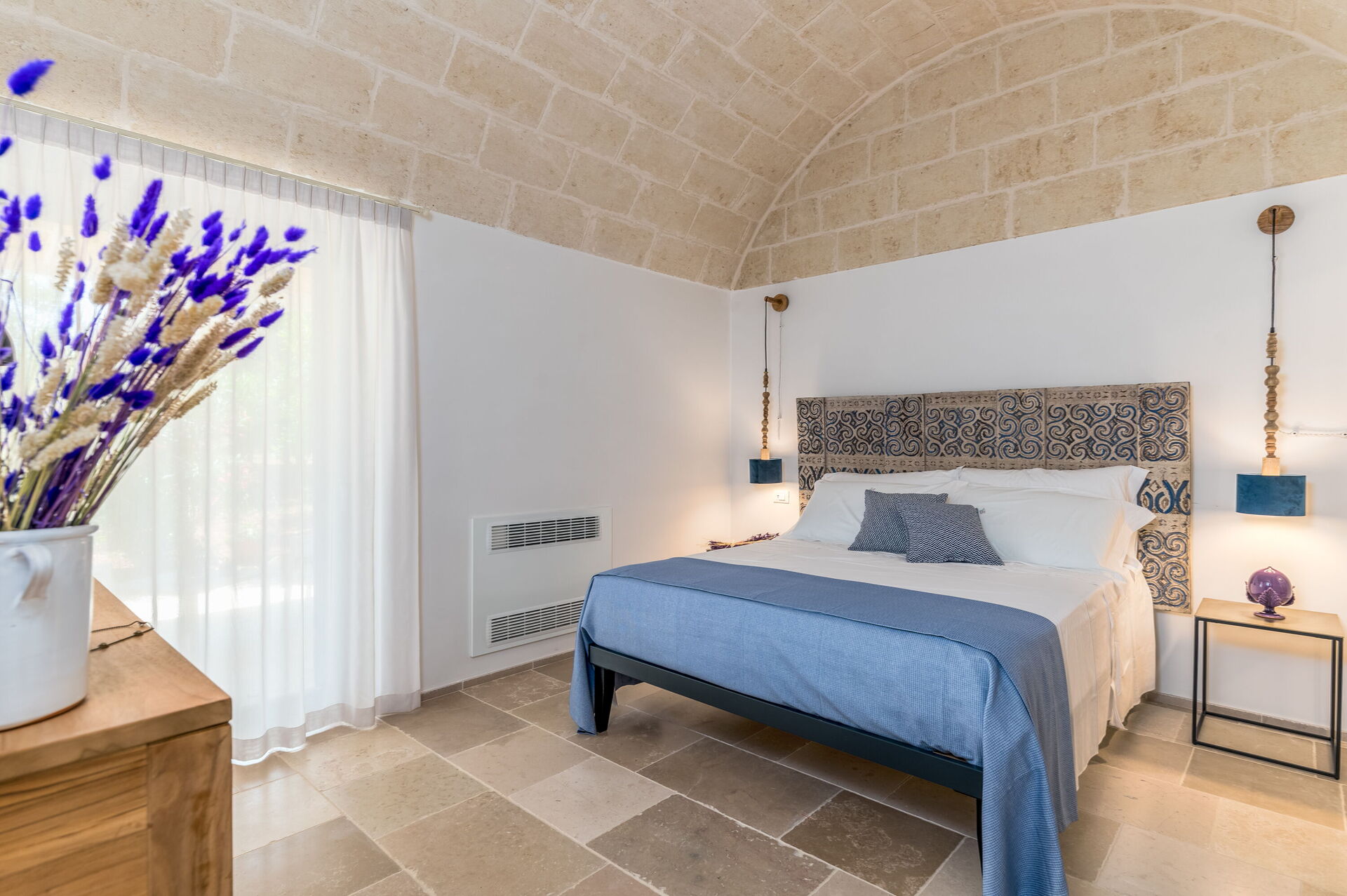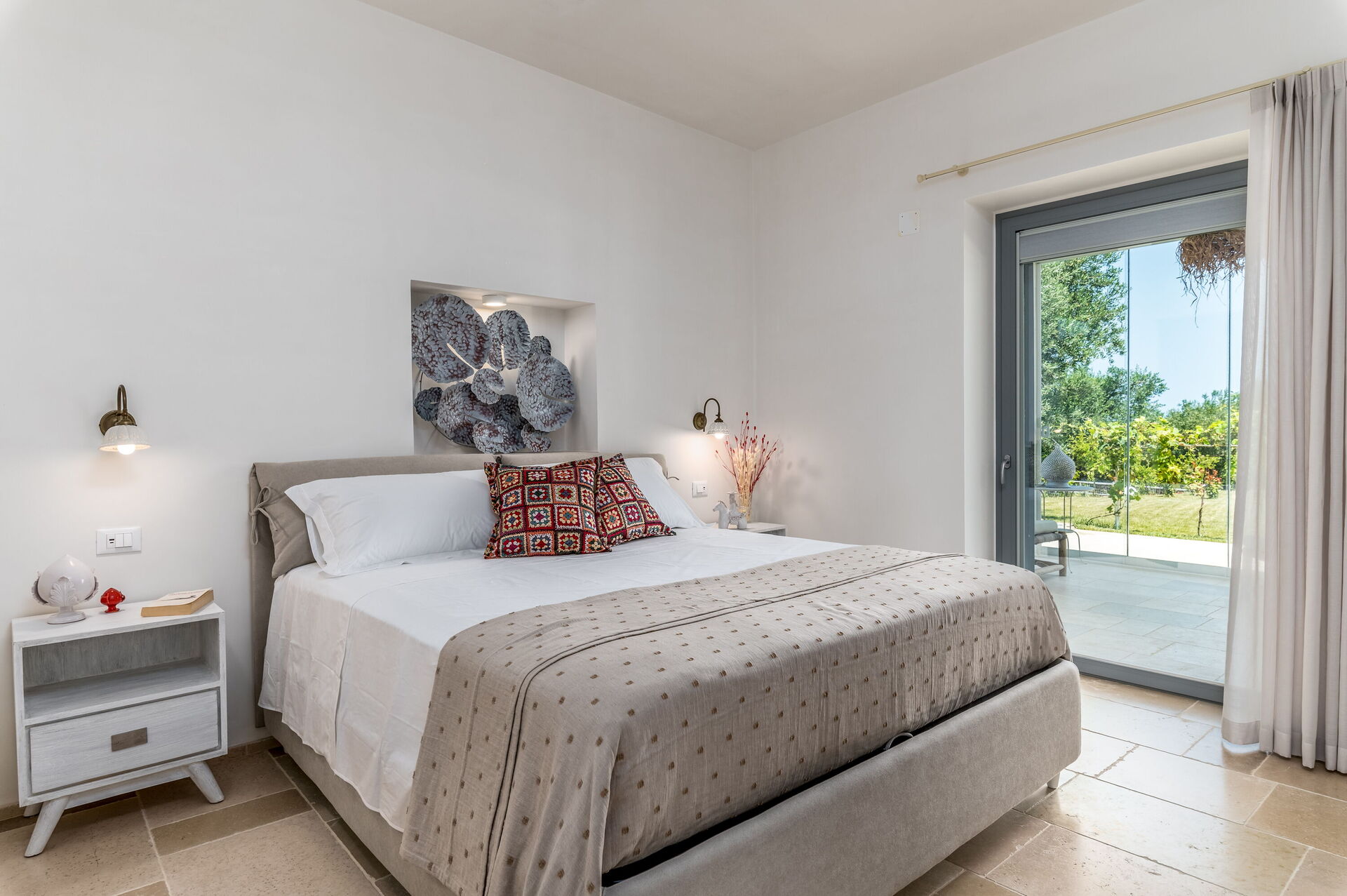Camera da letto con bagno 1: letto king size, letto matrimoniale, culla, internet WIFI, aria condizionata, zanzariere, tv satellitare, televisione, scrivania, bidet, doccia, asciugacapelli, uscita sul giardino, uscita sul patio, uscita sulla veranda.