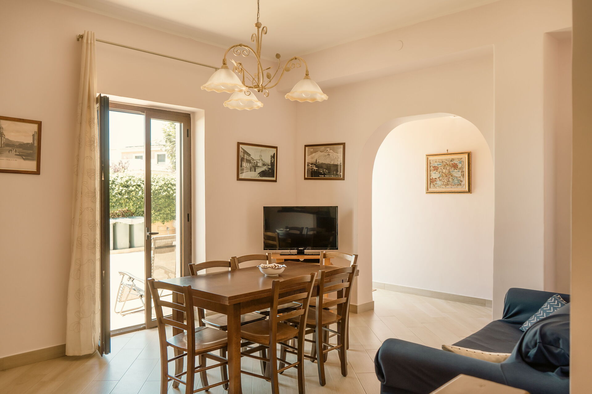 Cucina - soggiorno (60 m2): cucina ben attrezzata, tavolo da pranzo (persone: 7), frigo, freezer, piano cottura, forno, divano, aria condizionata, televisione, uscita sul patio.