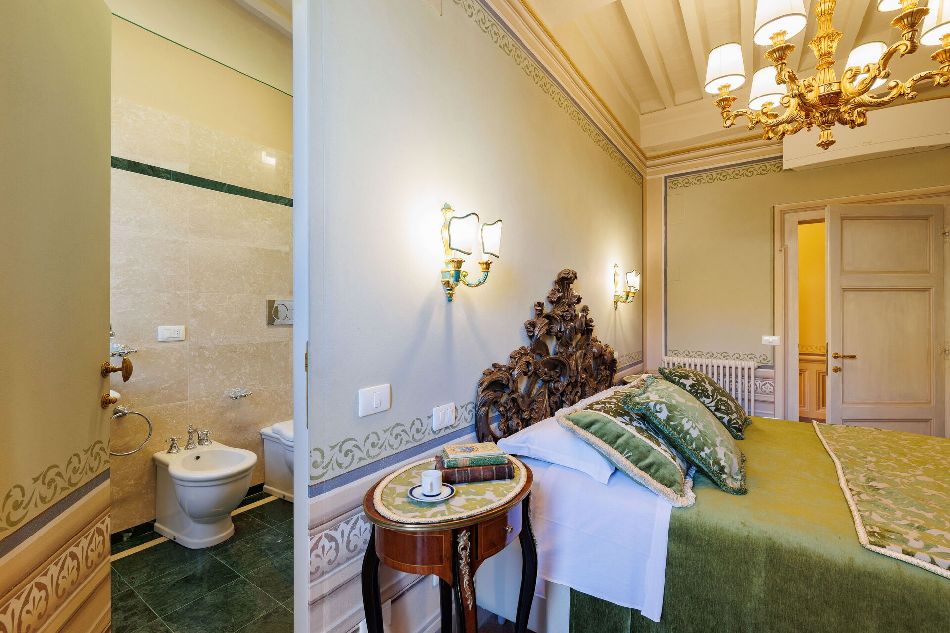 Camera da letto con bagno 1: letto matrimoniale (larghezza: 160m, lunghezza: 190m), internet WIFI, aria condizionata, lavandino, wc, bidet, doccia, asciugacapelli, uscita sulla terrazza.