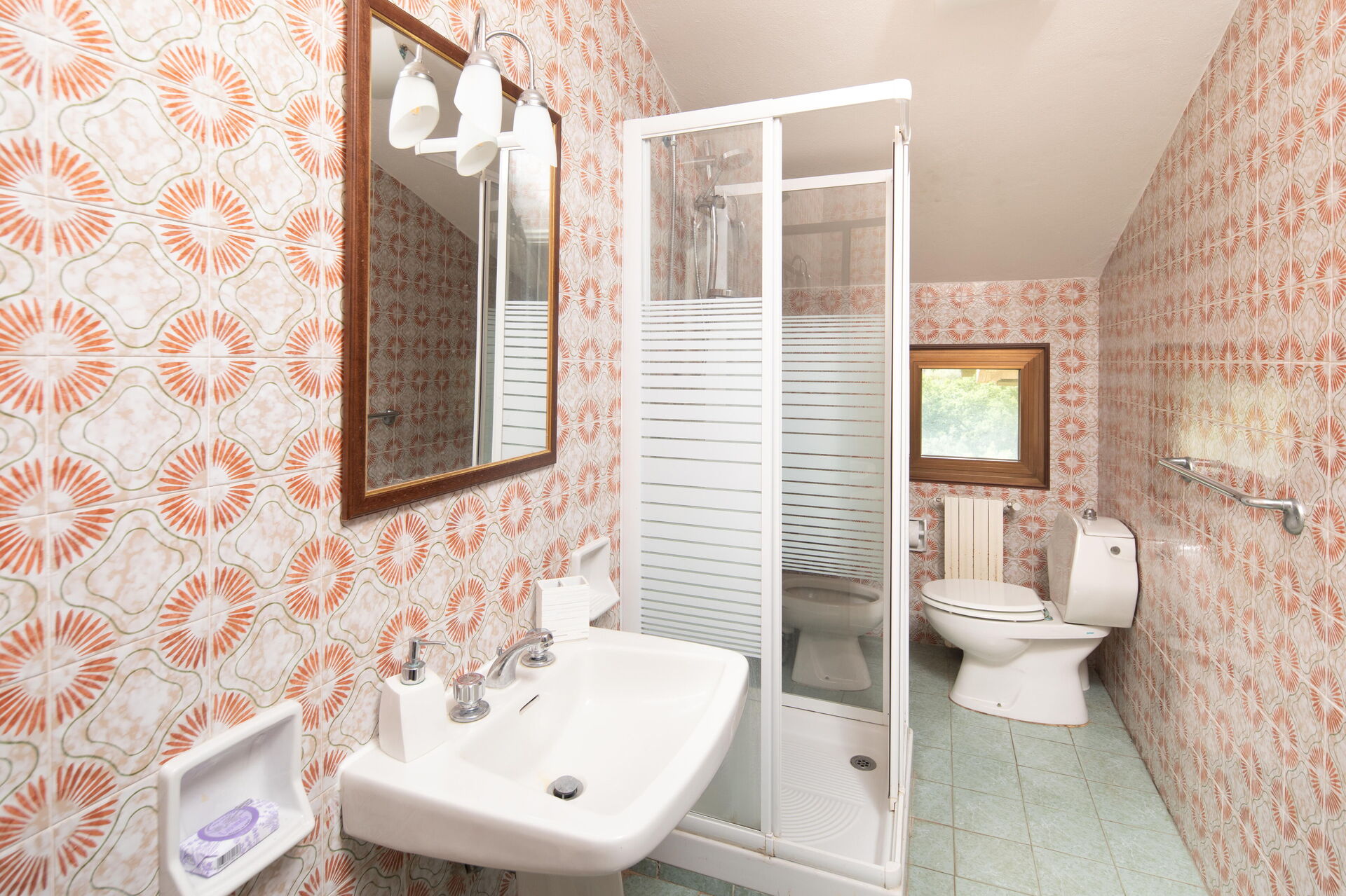 Bagno: lavandino, wc, bidet, doccia.