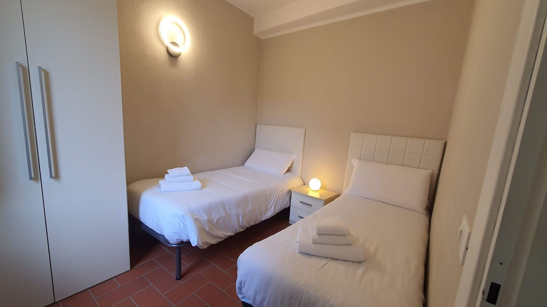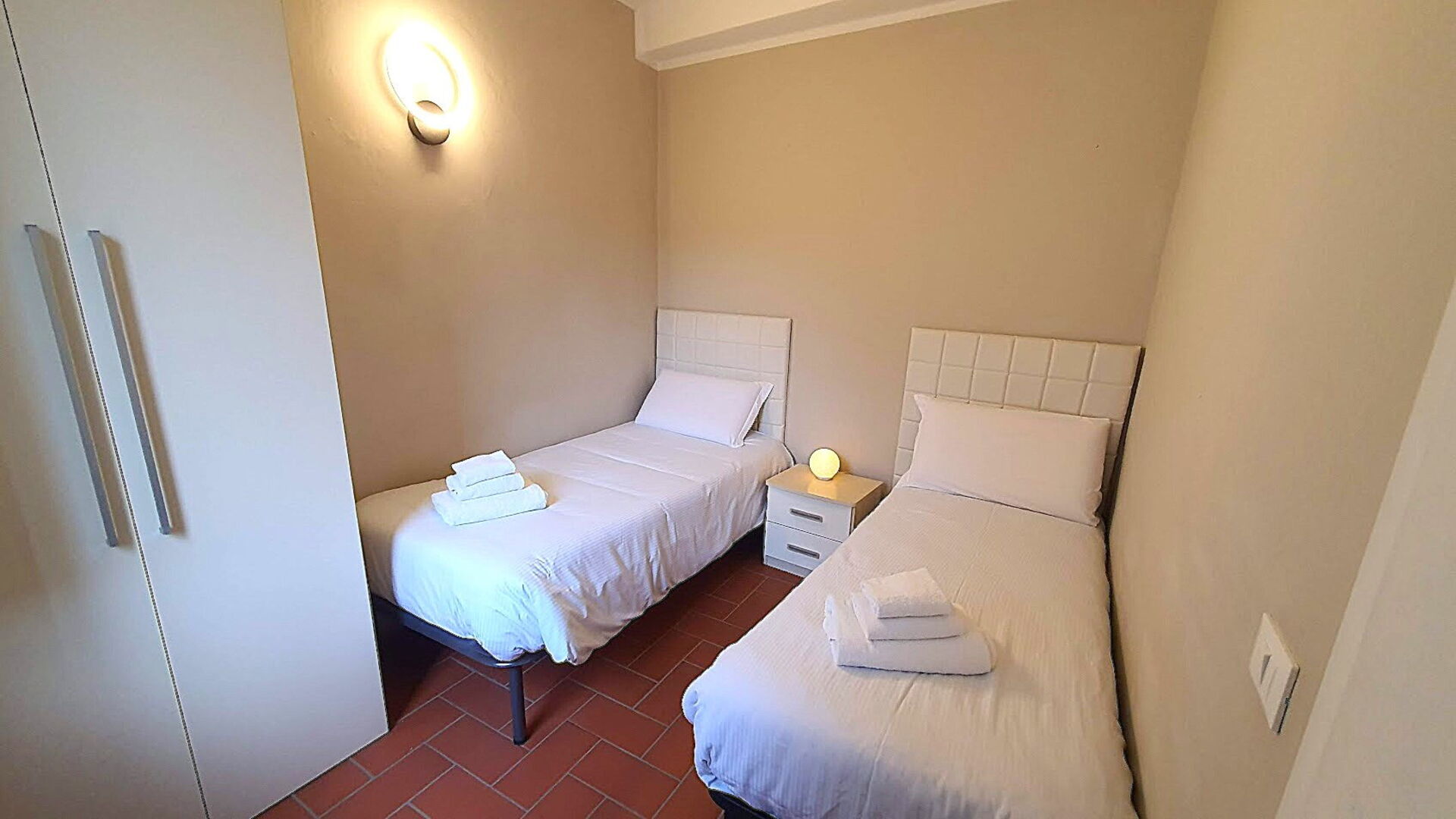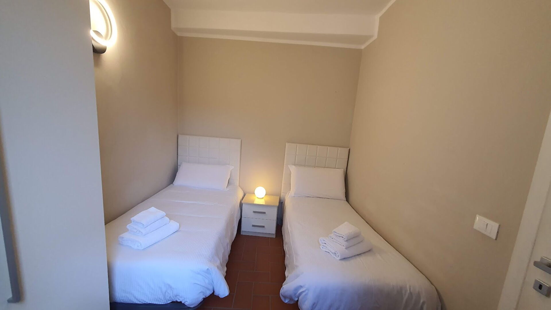 Camera da letto 2: due letti singoli, ventilatore portatile, scrivania.