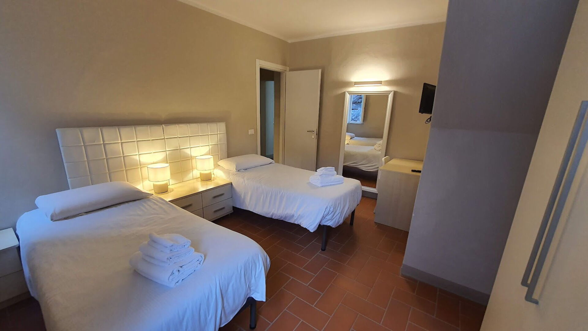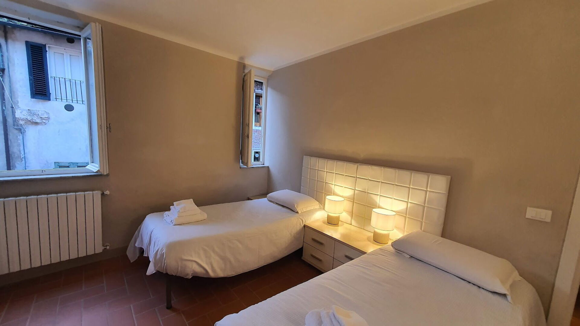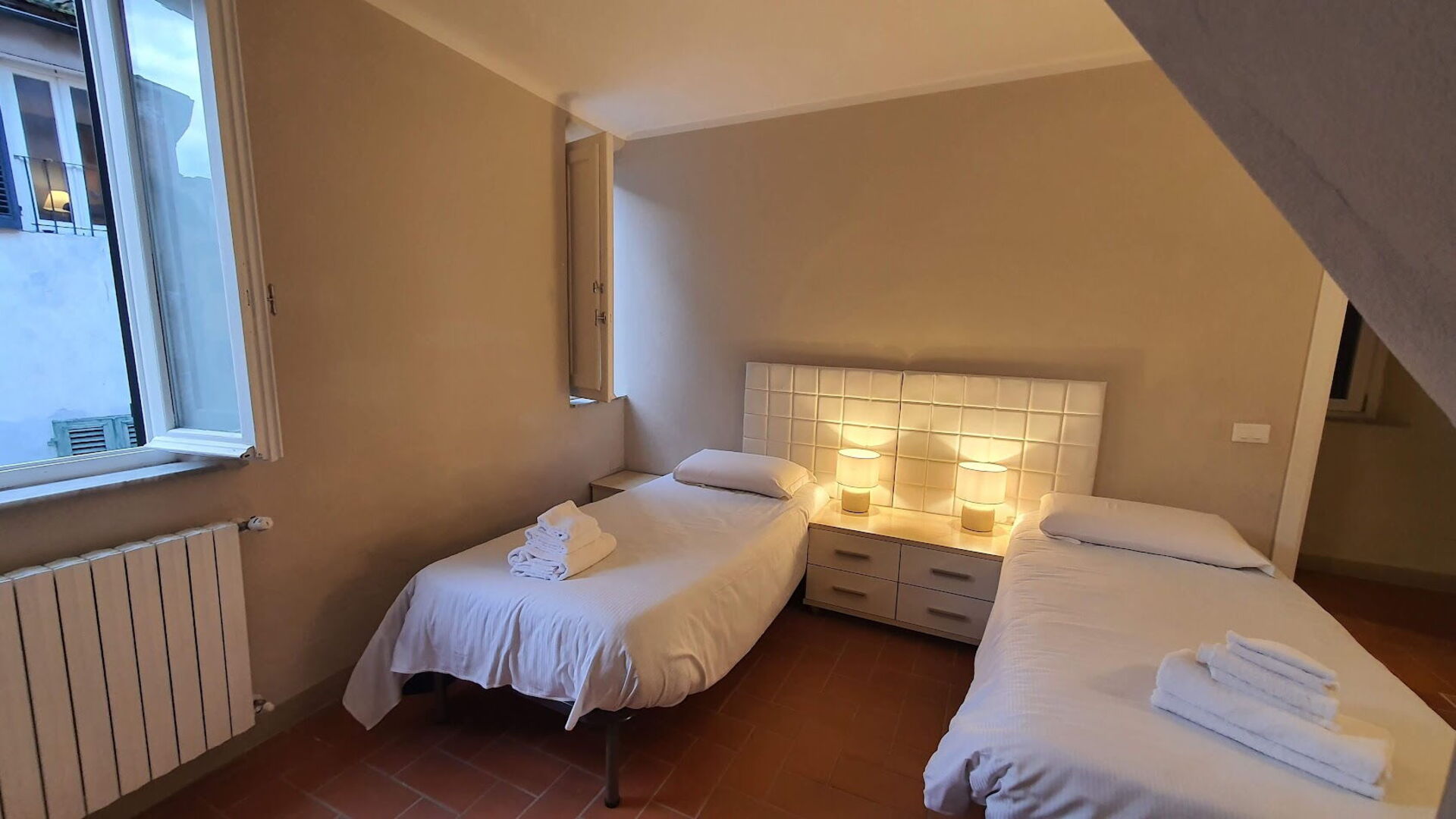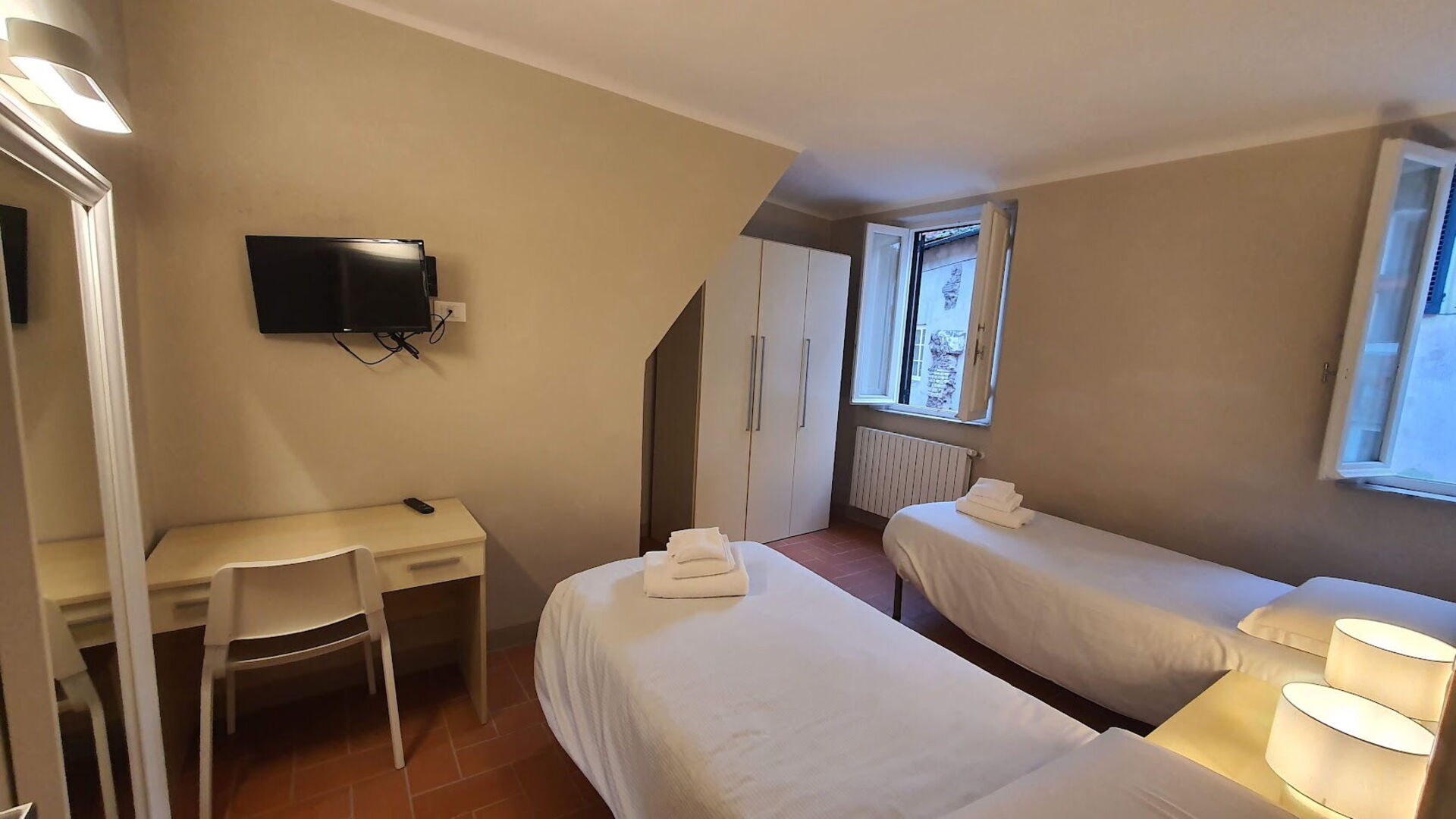 Camera da letto 2: due letti singoli, ventilatore portatile, scrivania.