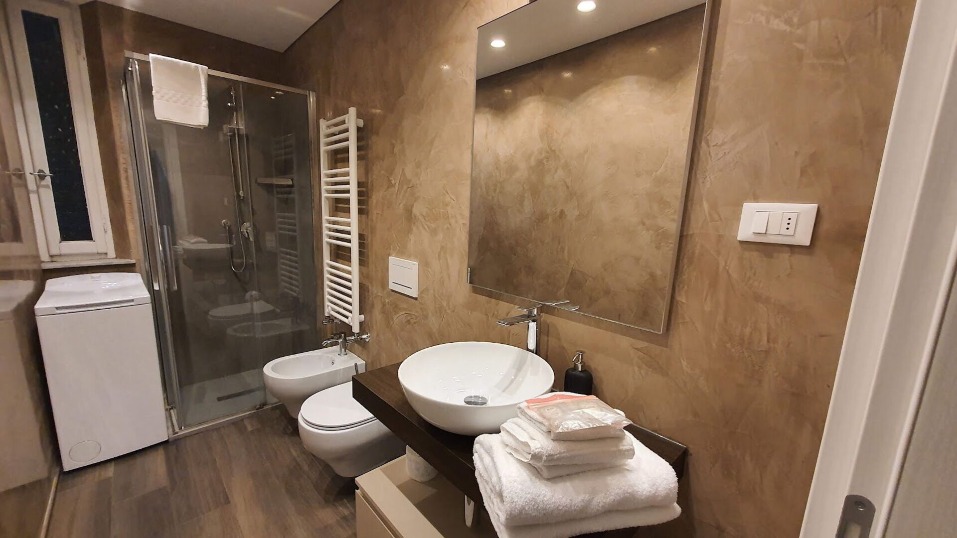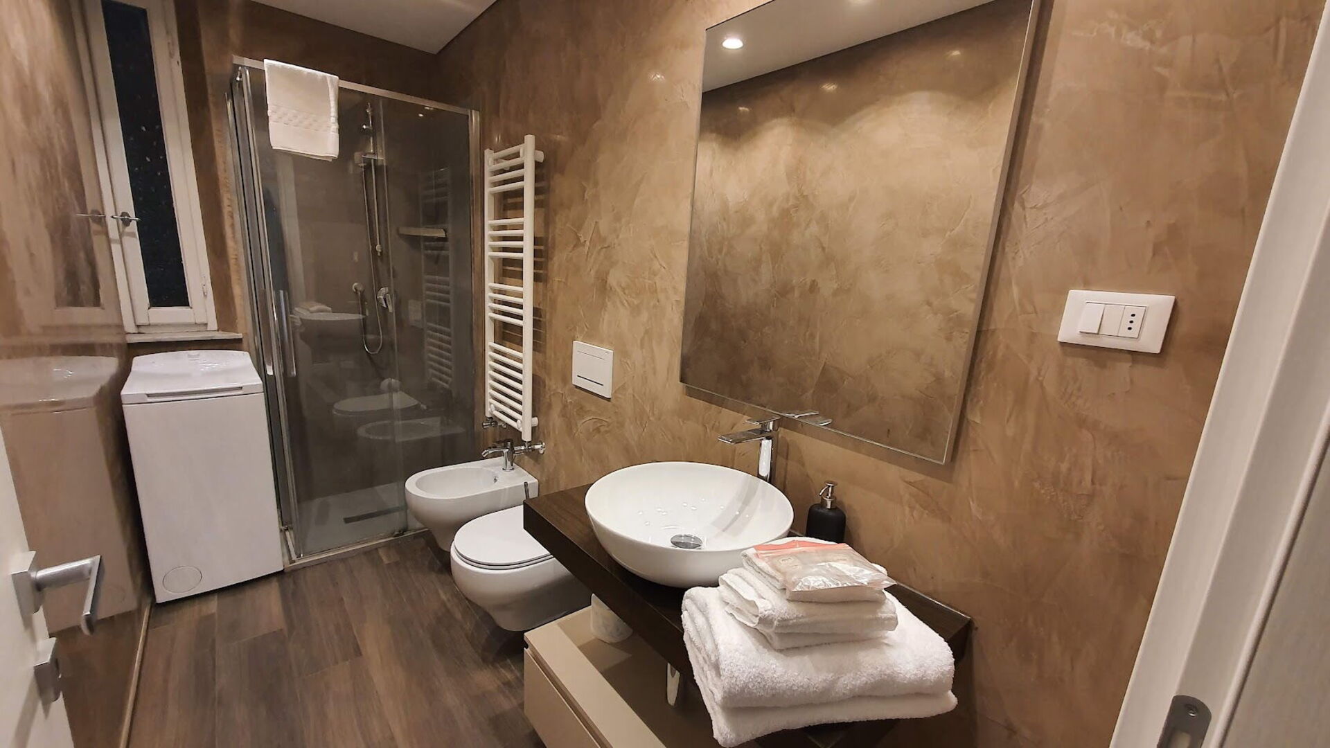 Bagno: lavandino, wc, bidet, doccia, lavatrice.
