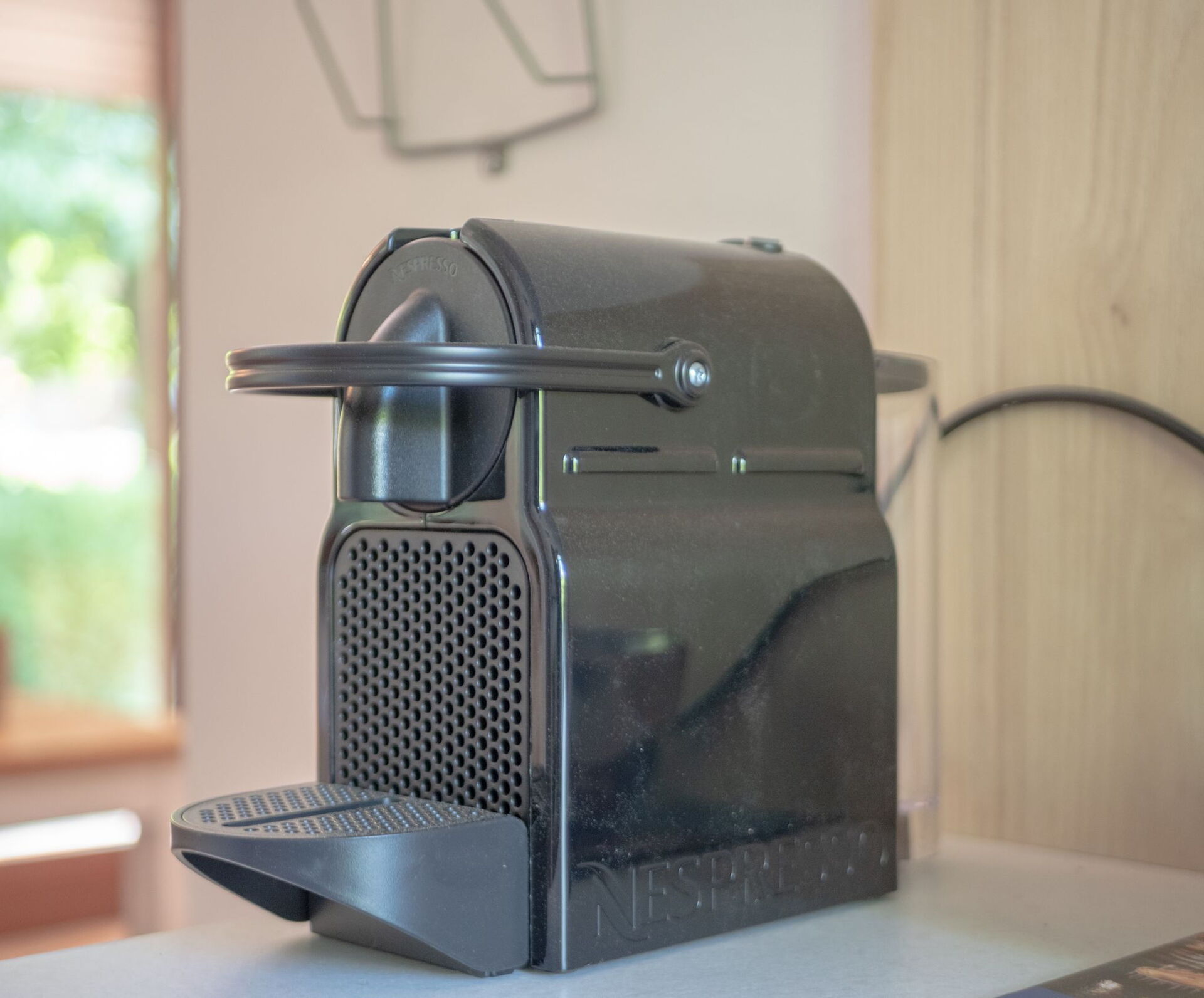 Cucina con forno, macchina da caffé e 4 fuochi cottura.
