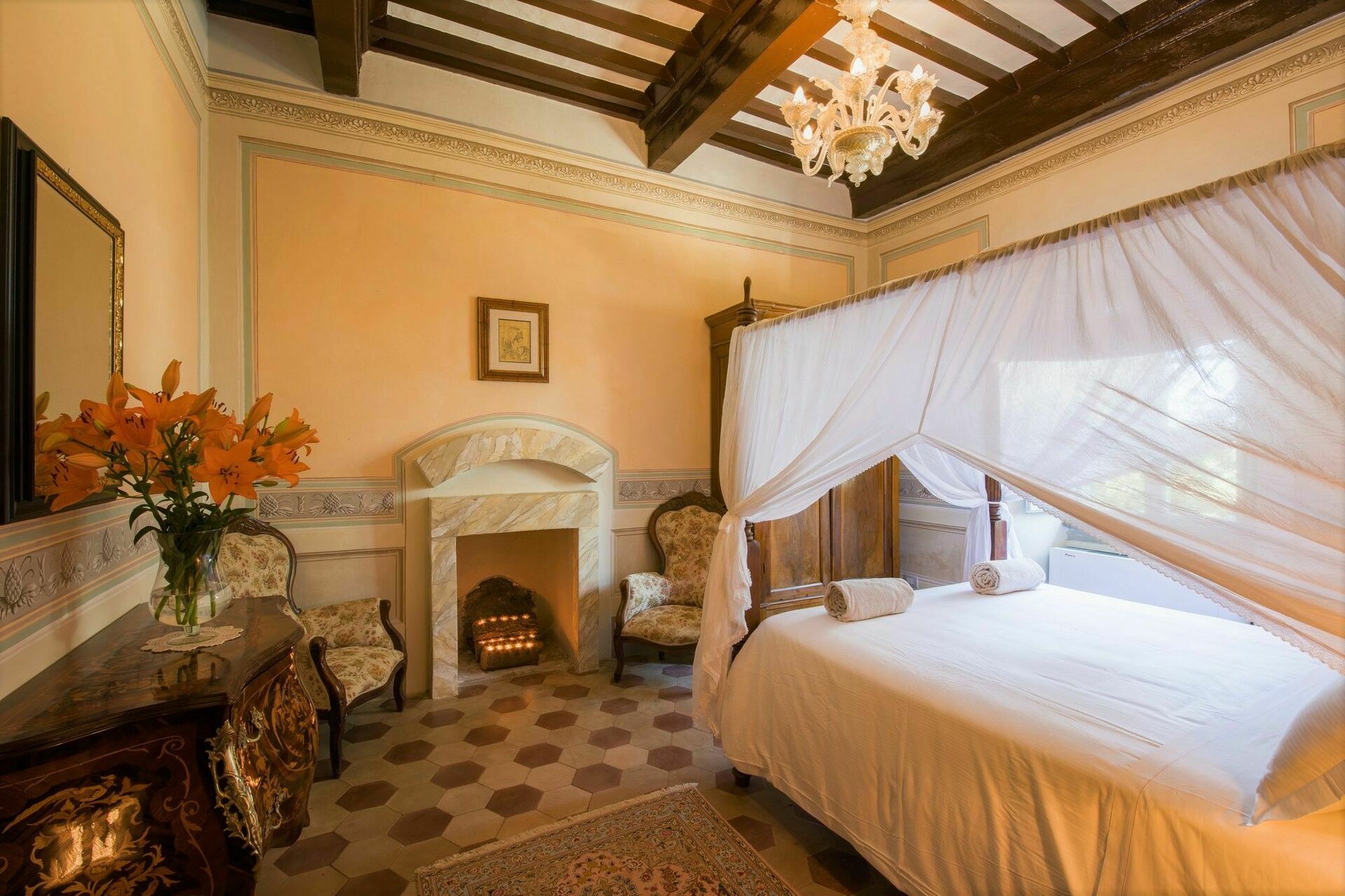 Camera da letto con bagno 3: letto king size, internet WIFI, internet, aria condizionata, zanzariere, tv satellitare, televisione, due poltrone, caminetto, lavandino, wc, bidet, doccia, asciugacapelli.