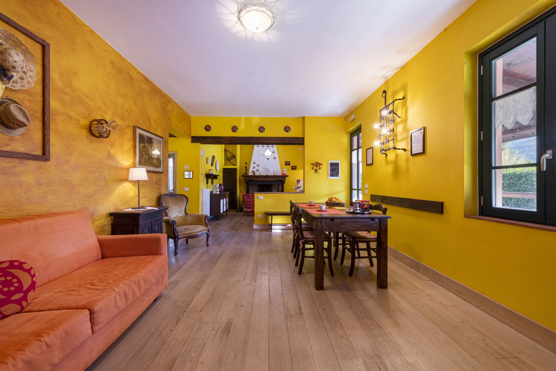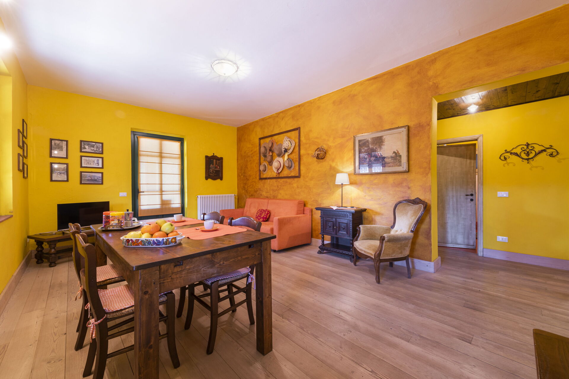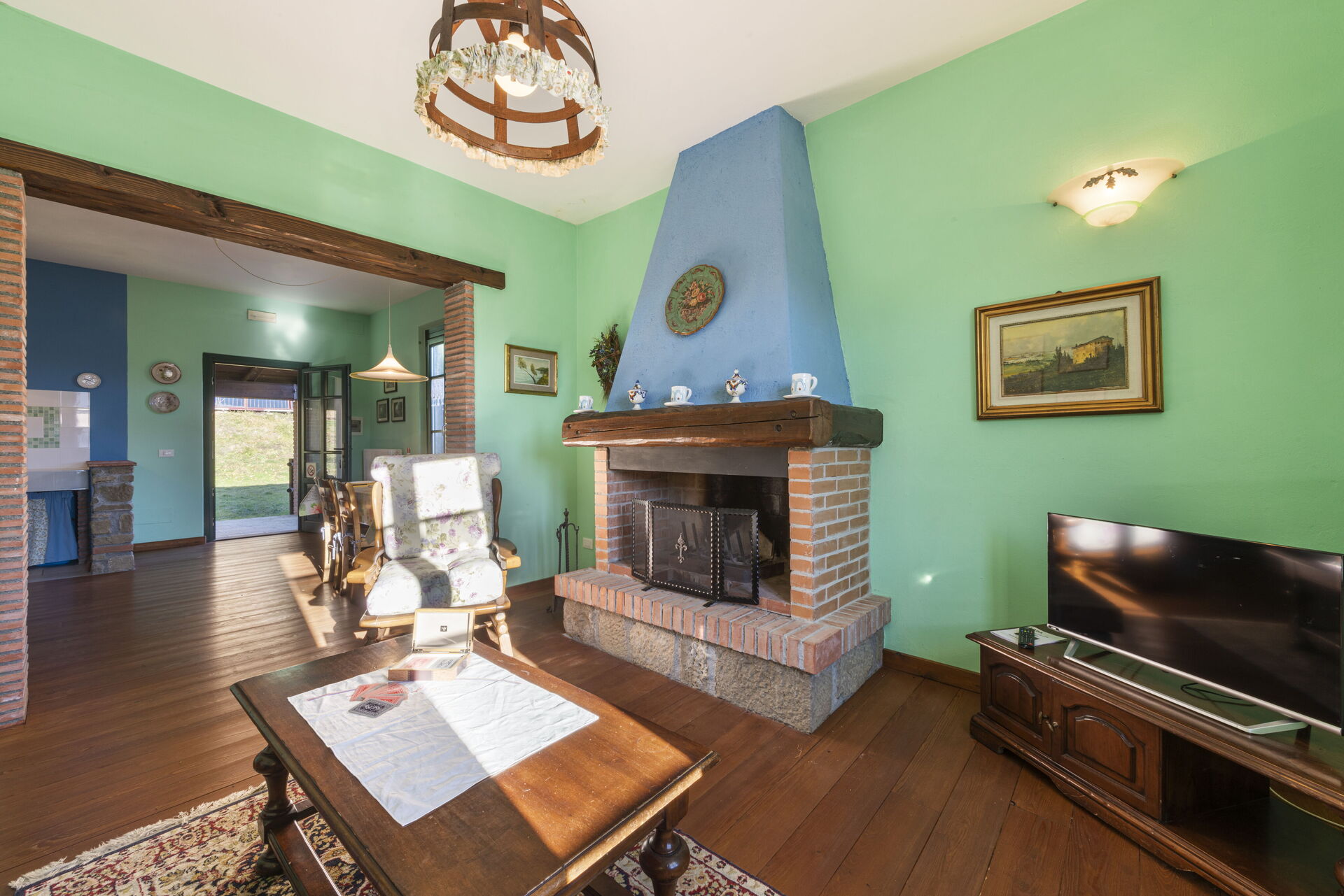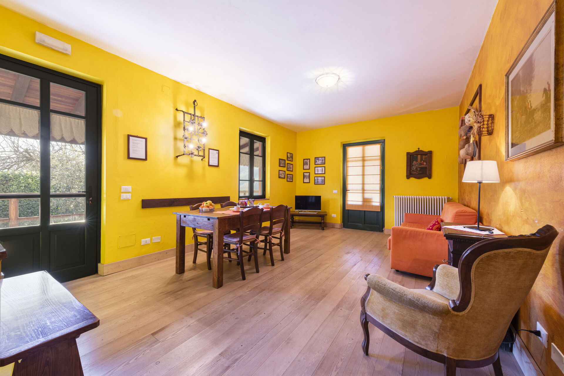 Soggiorno: divano, poltrona, tavolo da pranzo (persone: 6), internet, televisione, uscita sul giardino.
