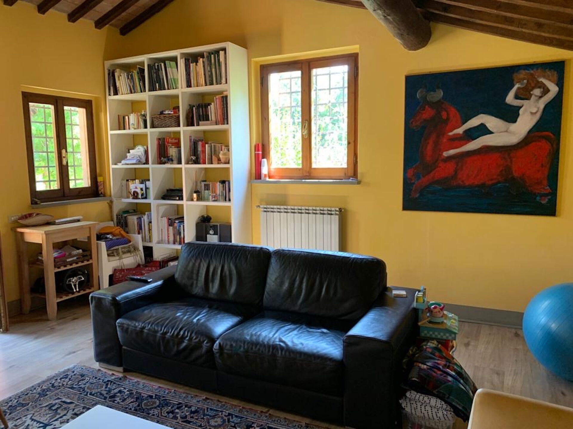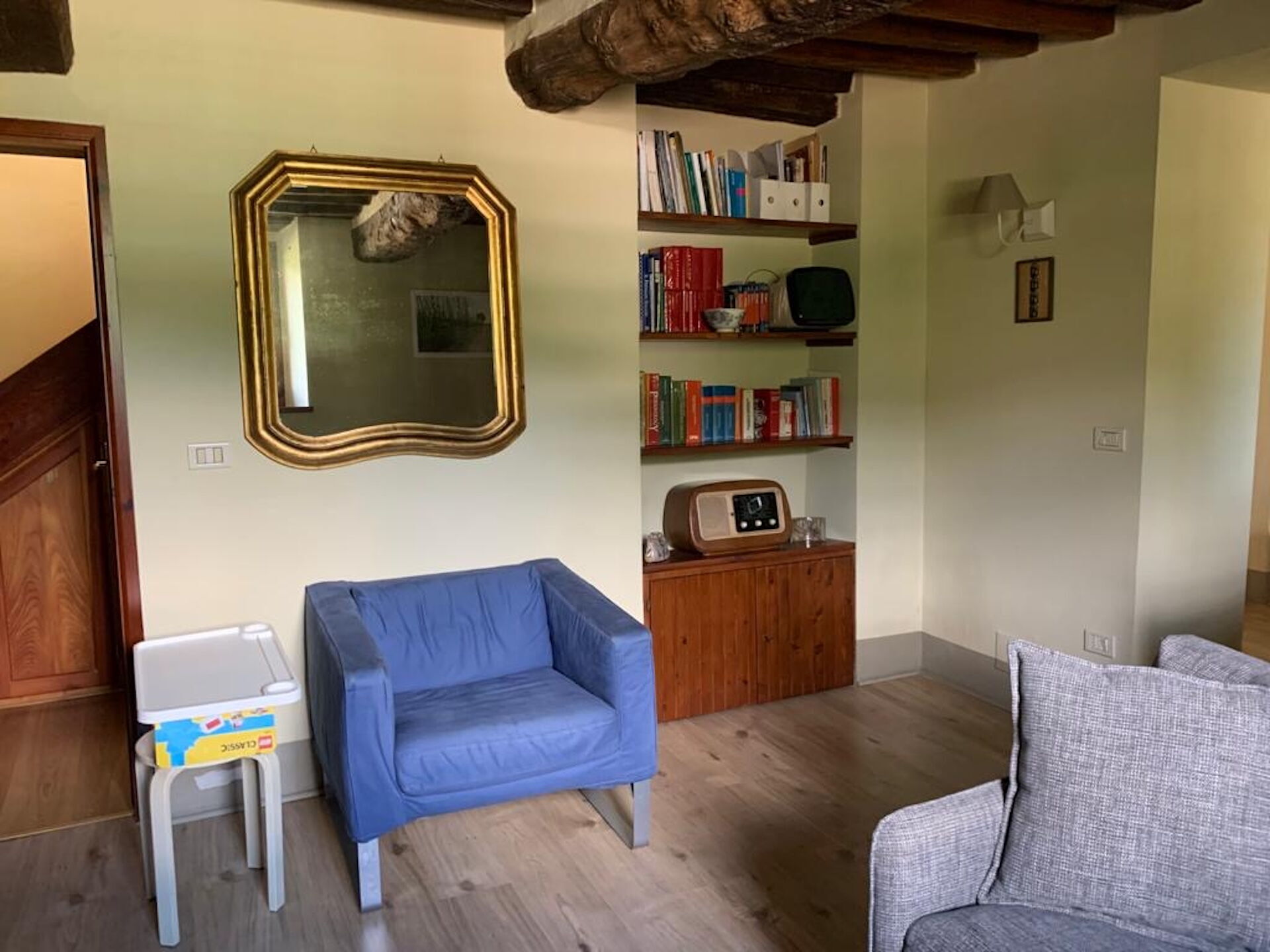 Soggiorno: divano, poltrona, caminetto, televisione, uscita sul giardino.
