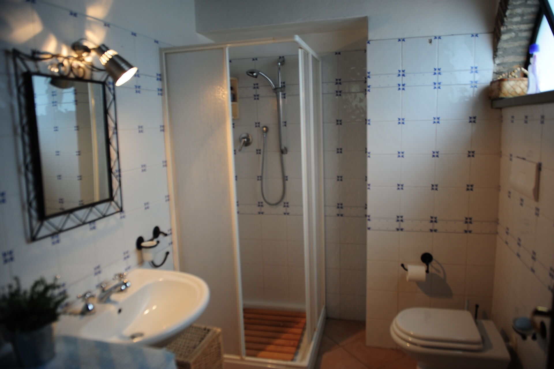 Bagno: lavandino, wc, doccia.