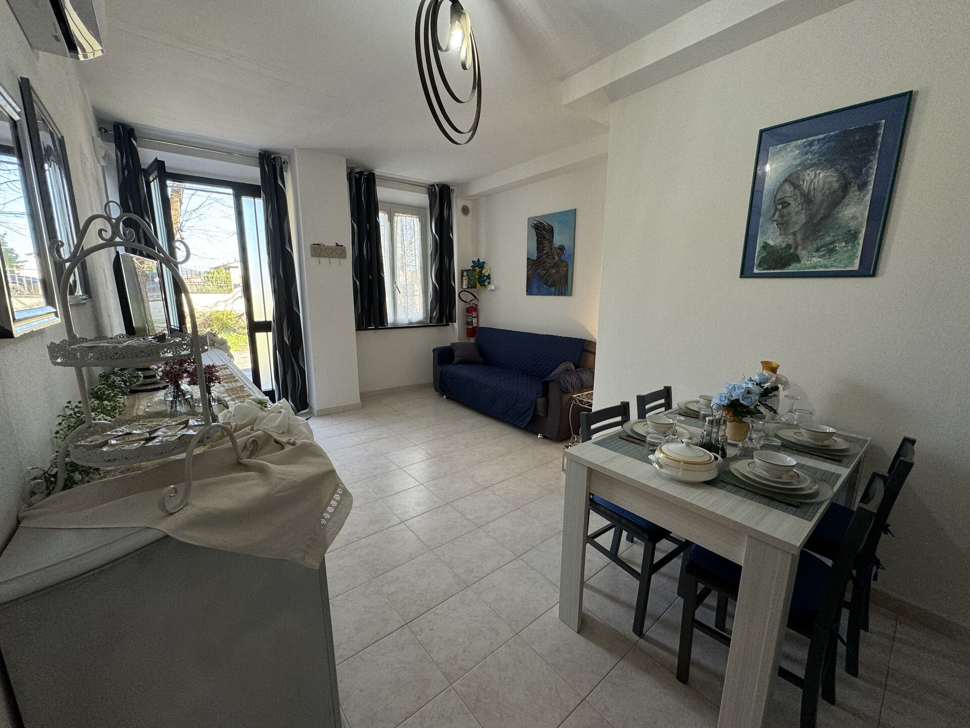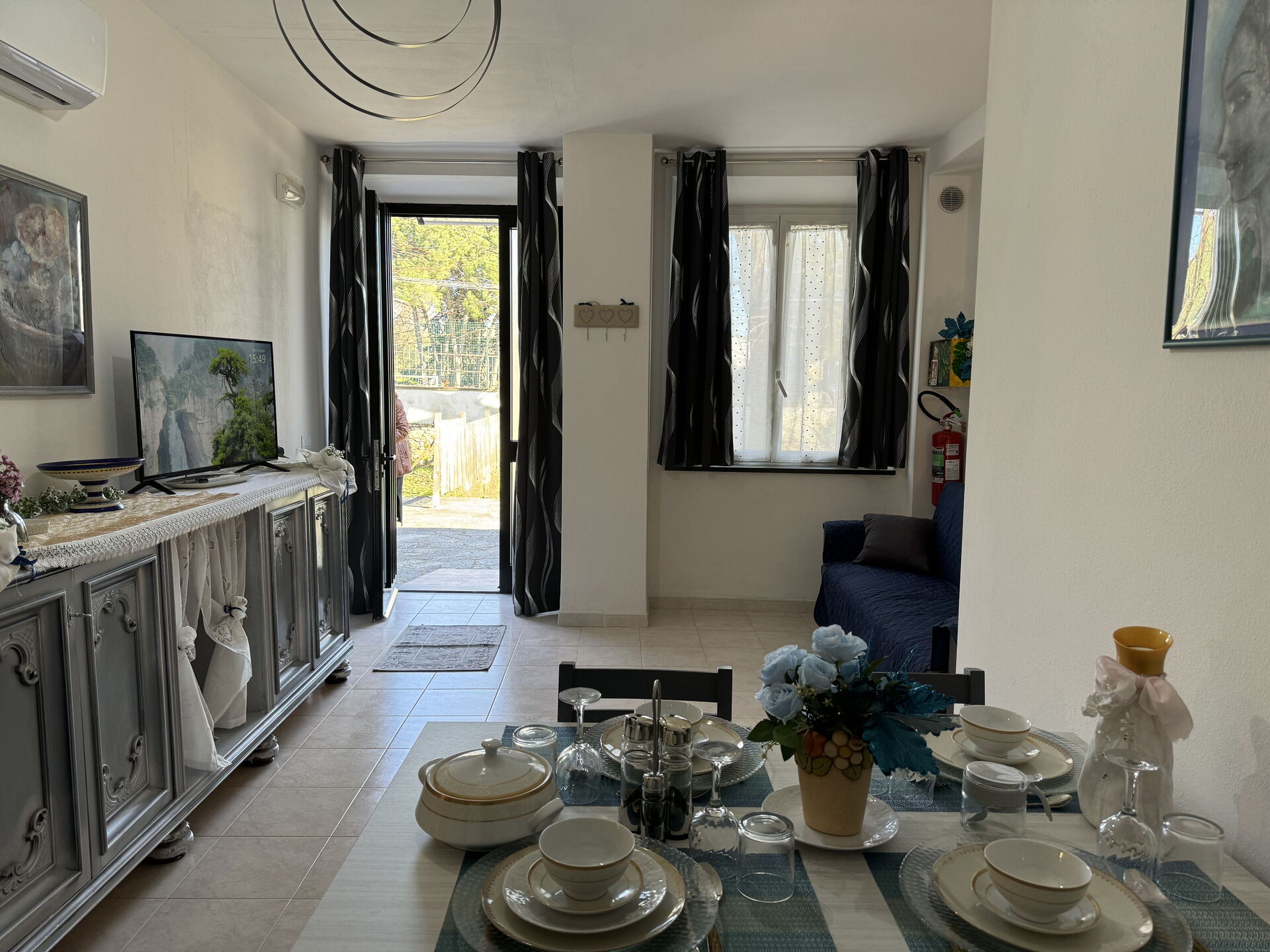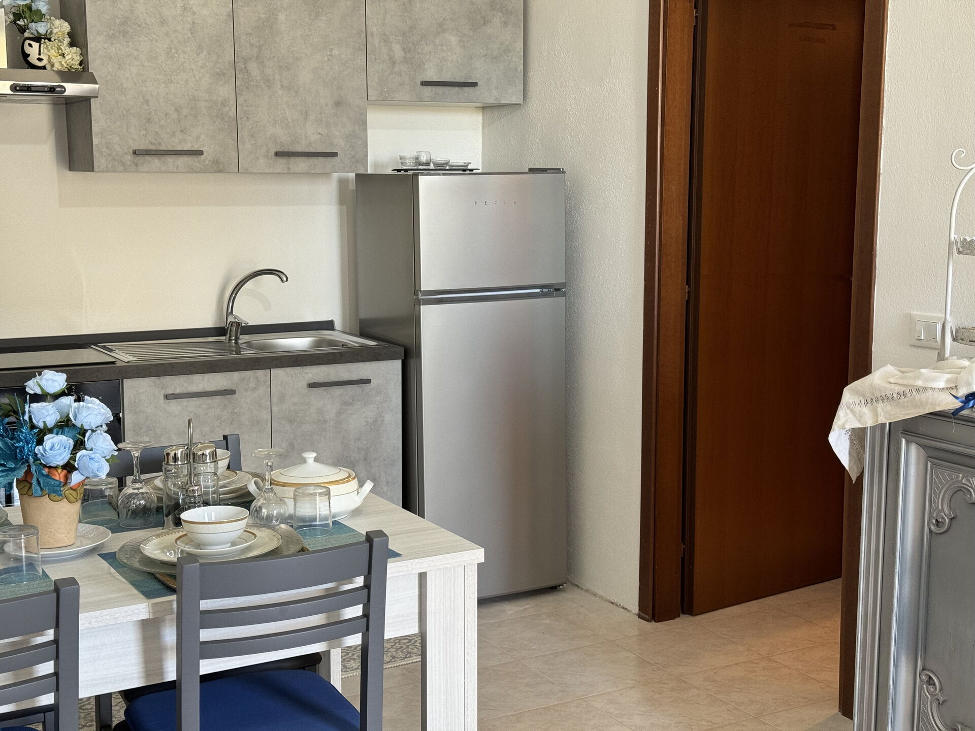 Cucina - soggiorno: cucina ben attrezzata, tavolo da pranzo (persone: 4), frigo, freezer, piano cottura, forno, tostapane, macchina da caffè americano, divano letto (larghezza: 1.4m), internet WIFI, aria condizionata, zanzariere, televisione, uscita sul giardino.